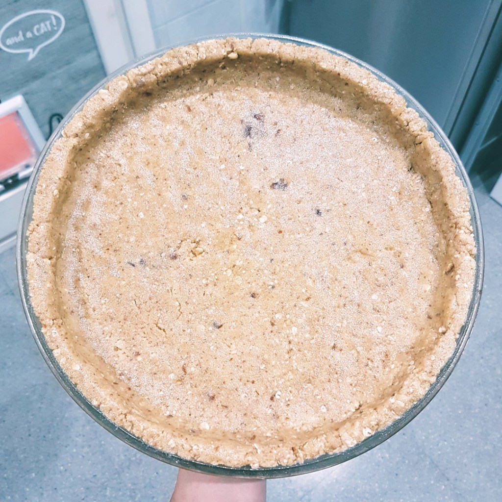 - Con la masa resultante forraremos un molde de unos 25 cm de diámetro y unos 2-3 cm de alto. Podemos hacerlo con las manos o con una cuchara. Igualar bien toda la masa.