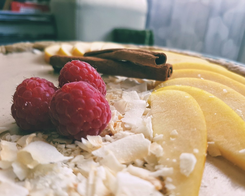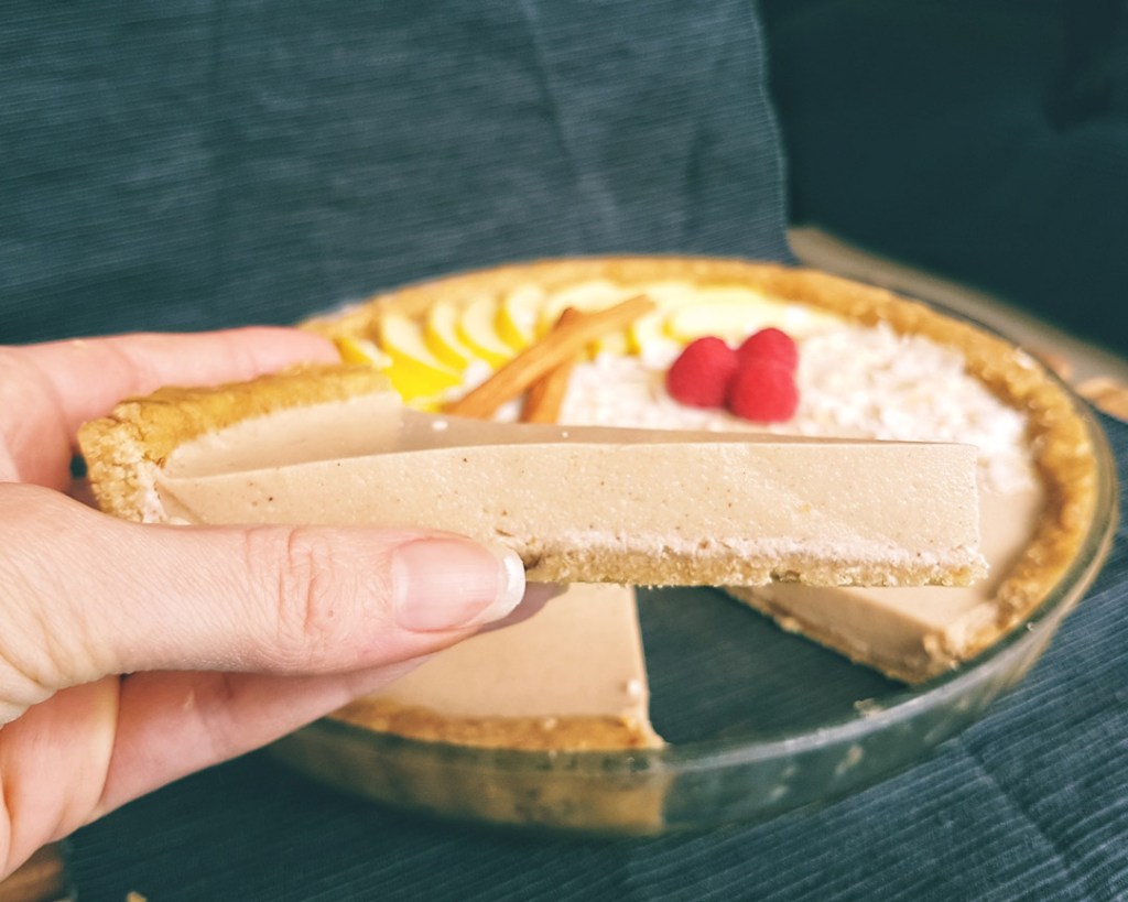 El relleno es una mezcla de manzana triturada y leche de coco, cuajada con agar-agar. Su textura os recordará a una panacota suave, con un ligero toque de canela.