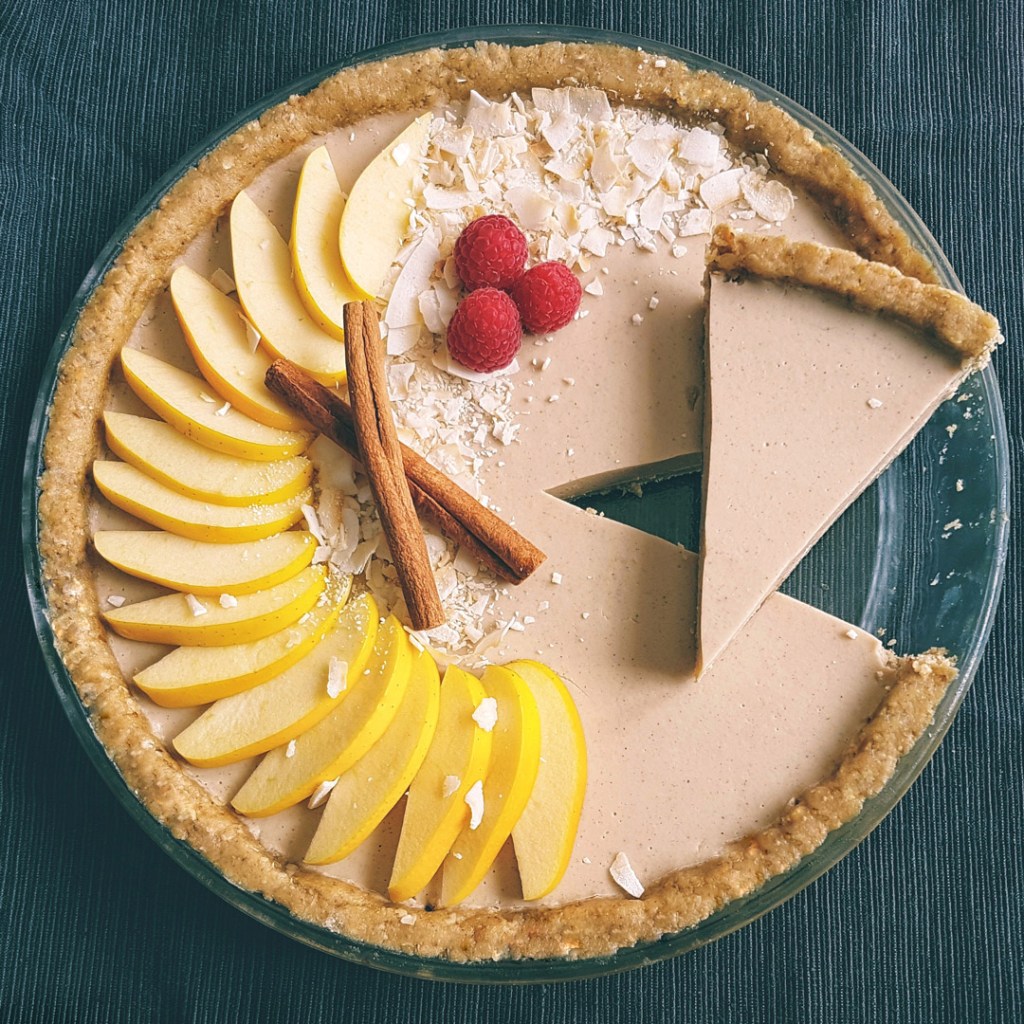 Esta tarta fría de manzana no lleva nada de horneado, todos los ingredientes están en crudo, a excepción del pequeño hervor del relleno para activar el agar-agar.