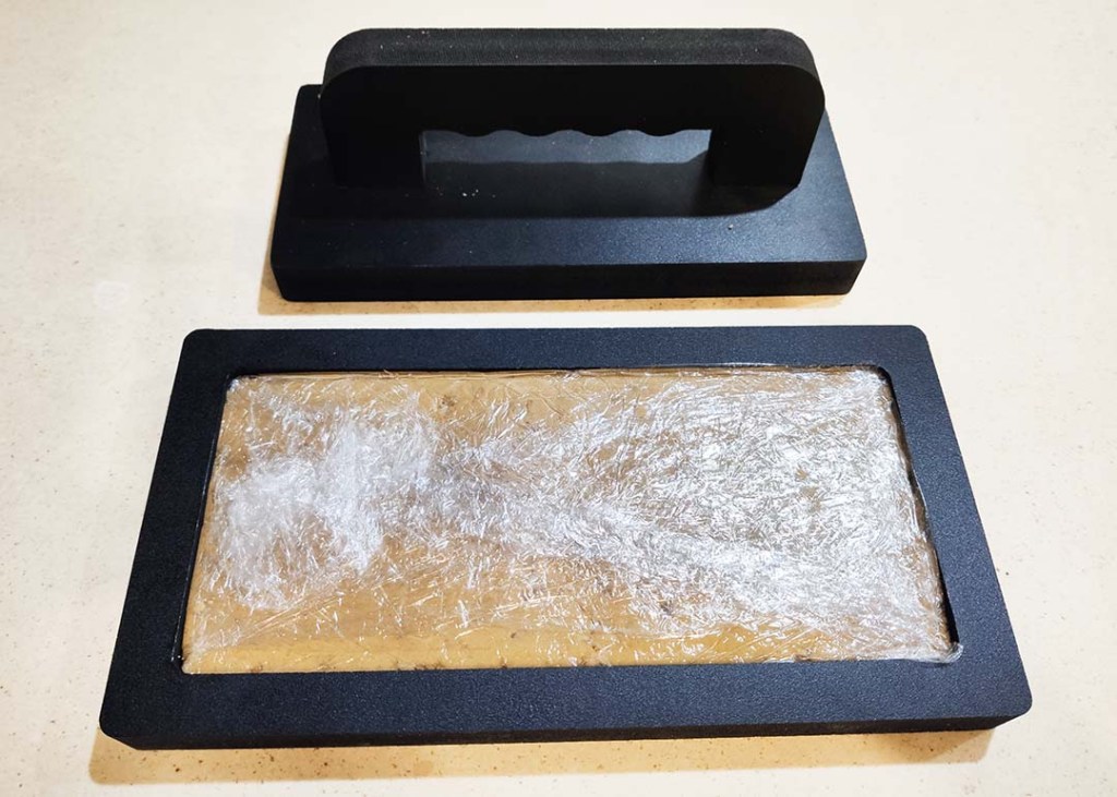 Pues la manera más sencilla es que tengas en casa un molde para turrones blandos que te permita poder apretar la masa y compactarla. Un buen amigo me fabricó éste que veis en la foto, junto con una tapa con asa, para poder apretar bien los ingredientes. Si no tienes, utiliza un túper o cualquier otro recipiente forrado con film transparente o fabrícate no con un tetrabrik vacío. Por internet puedes encontrar videos explicando como hacer este tipo de moldes de manera artesana y súper económica 🙂